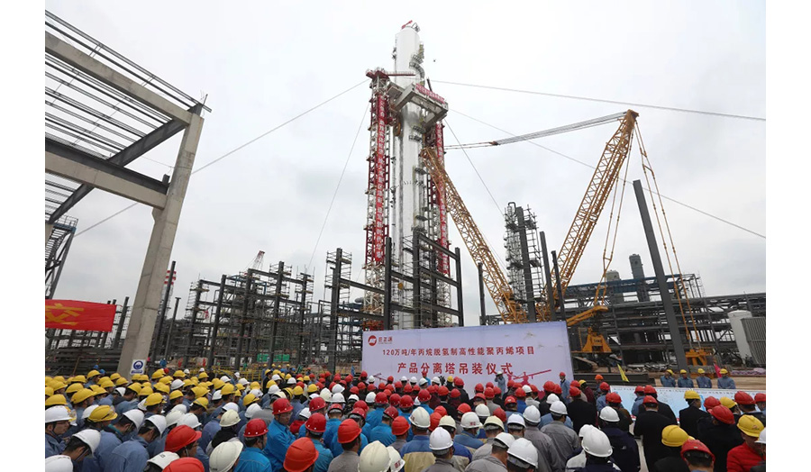 12月12日上午,巨正源公司120萬噸/年丙烷脫氫制高性能聚丙烯項(xiàng)目(以下簡(jiǎn)稱“丙烷脫氫項(xiàng)目”)產(chǎn)品分離塔吊裝儀式在東莞市沙田鎮(zhèn)立沙島舉行。最大直徑12米、高128米,總重量約3050噸的“巨無霸”——產(chǎn)品分離塔整體一次成功吊裝就位,創(chuàng)造了國(guó)內(nèi)乃至亞洲大型設(shè)備吊裝新紀(jì)錄,同時(shí)也標(biāo)志著丙烷脫氫項(xiàng)目第一階段工程建設(shè)全面進(jìn)入沖刺階段。