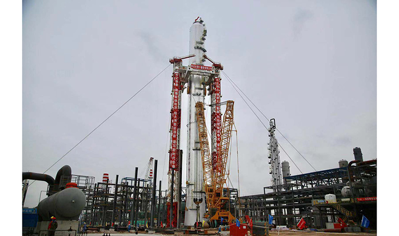 產(chǎn)品分離塔是丙烷脫氫項(xiàng)目的核心設(shè)備之一,用于分離丙烯與丙烷。該設(shè)備采用整體制造、整體運(yùn)輸、整體吊裝,最大直徑12米、高128米,總重量約3050噸,為國(guó)內(nèi)同類產(chǎn)品之最。其吊裝采用國(guó)內(nèi)先進(jìn)的3600噸液壓頂升裝置主吊,運(yùn)用“液壓同步頂升技術(shù)”將設(shè)備直立、拔高、就位。同時(shí),1250噸級(jí)履帶式起重機(jī)采用在設(shè)備正后方行走遞送的方法,使設(shè)備由平臥狀態(tài)逐漸過渡到直立狀態(tài),完成設(shè)備整體吊裝就位。