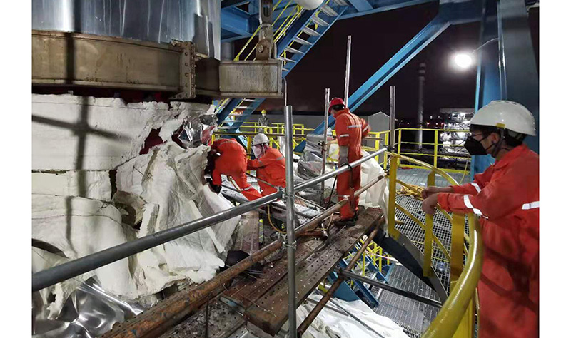 2月12日早上,丙烷脫氫裝置再生空氣進料加熱爐錐段和直管管段焊縫開裂,裂縫長達2.5m,650℃的高溫再生空氣從裂縫漏出。公司高度重視,立即啟動緊急預案,特護運行,討論堵漏方案,落實特殊作業施工隊伍,按照政府及公司規定完成入廠教育及疫情期間人員備案,嚴防死守做好防疫工作,組織高溫堵漏隊伍進場。