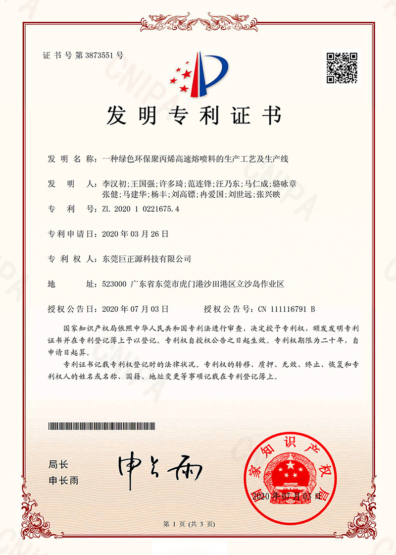近日,由巨正源科技公司自主研發的“一種綠色環保聚丙烯高速熔噴料的生產工藝及生產線”獲得國家知識產權局授予發明專利證書(專利號:ZL202010221675.4)。這也是巨正源科技公司獲得的首個發明專利。