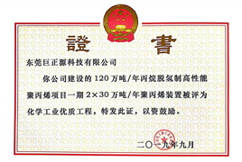 近日,中國化工施工企業(yè)協(xié)會(huì)公布全面提升工程質(zhì)量創(chuàng)建優(yōu)質(zhì)精品工程活動(dòng)成果。巨正源公司投資建設(shè)的“120萬噸/年丙烷脫氫制高性能聚丙烯項(xiàng)目”一期2×30萬噸/年聚丙烯裝置獲評全國“化學(xué)工業(yè)優(yōu)質(zhì)工程”。