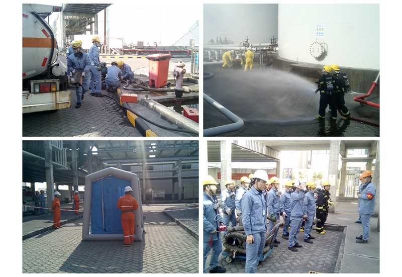 1月23日,盛源公司聯(lián)合立沙島應(yīng)急基地在罐區(qū)舉行了T610罐金屬軟管破裂“盲演”(不預(yù)先通知時間、地點(diǎn),不設(shè)臺詞劇本)。現(xiàn)場作業(yè)人員發(fā)現(xiàn)T610罐金屬軟管發(fā)生破裂泄漏后迅速報告,總指揮迅速啟動公司生產(chǎn)事故二級響應(yīng),現(xiàn)場指揮組織各應(yīng)急小組集合趕赴現(xiàn)場開展堵漏搶險工作。搶險救援組對泄漏點(diǎn)進(jìn)行堵漏,但并未堵漏成功,隨后聯(lián)系立沙島應(yīng)急基地請求外部支援。立沙島應(yīng)急基地人員到達(dá)現(xiàn)場后,與公司各應(yīng)急小組人員緊密配合,最終堵漏成功。